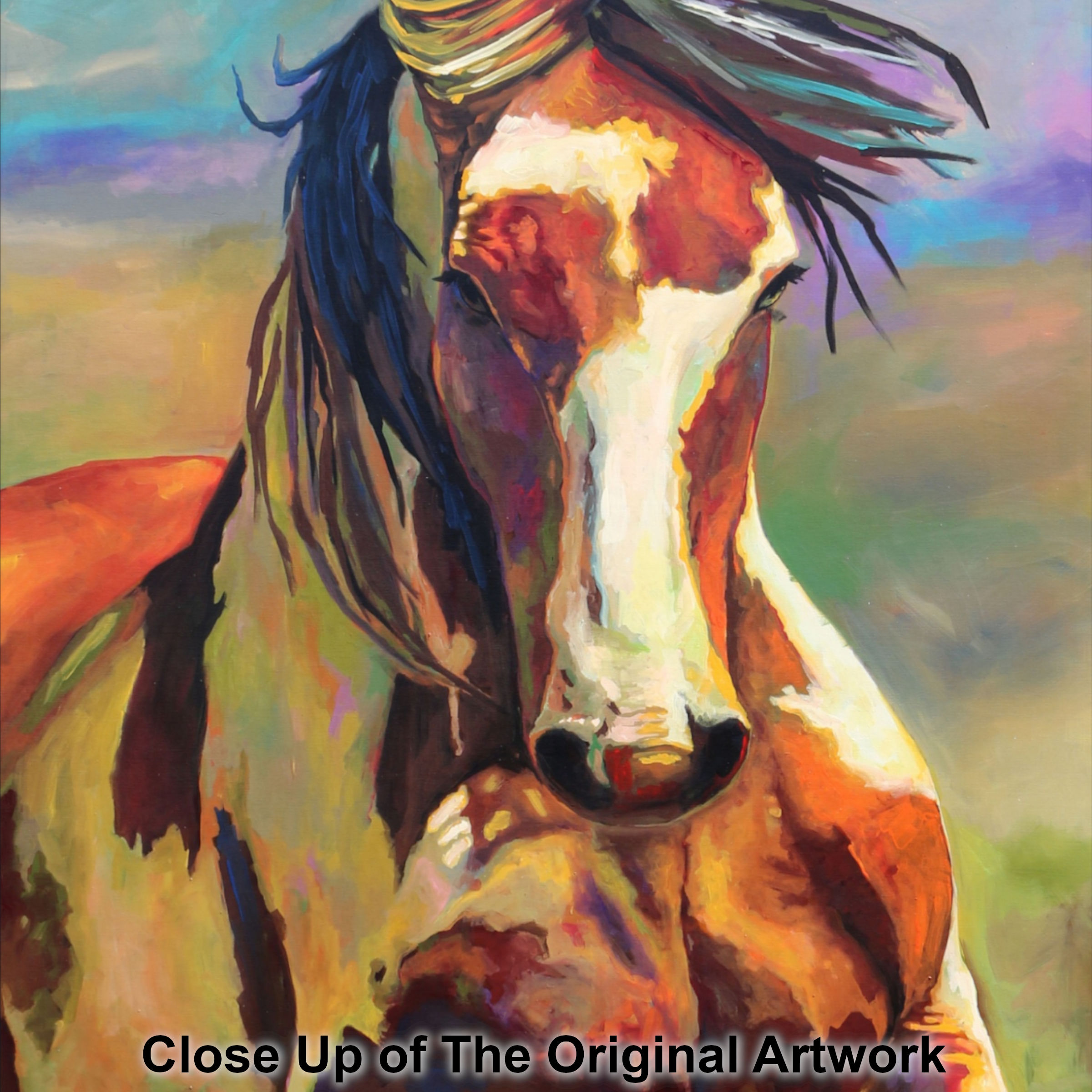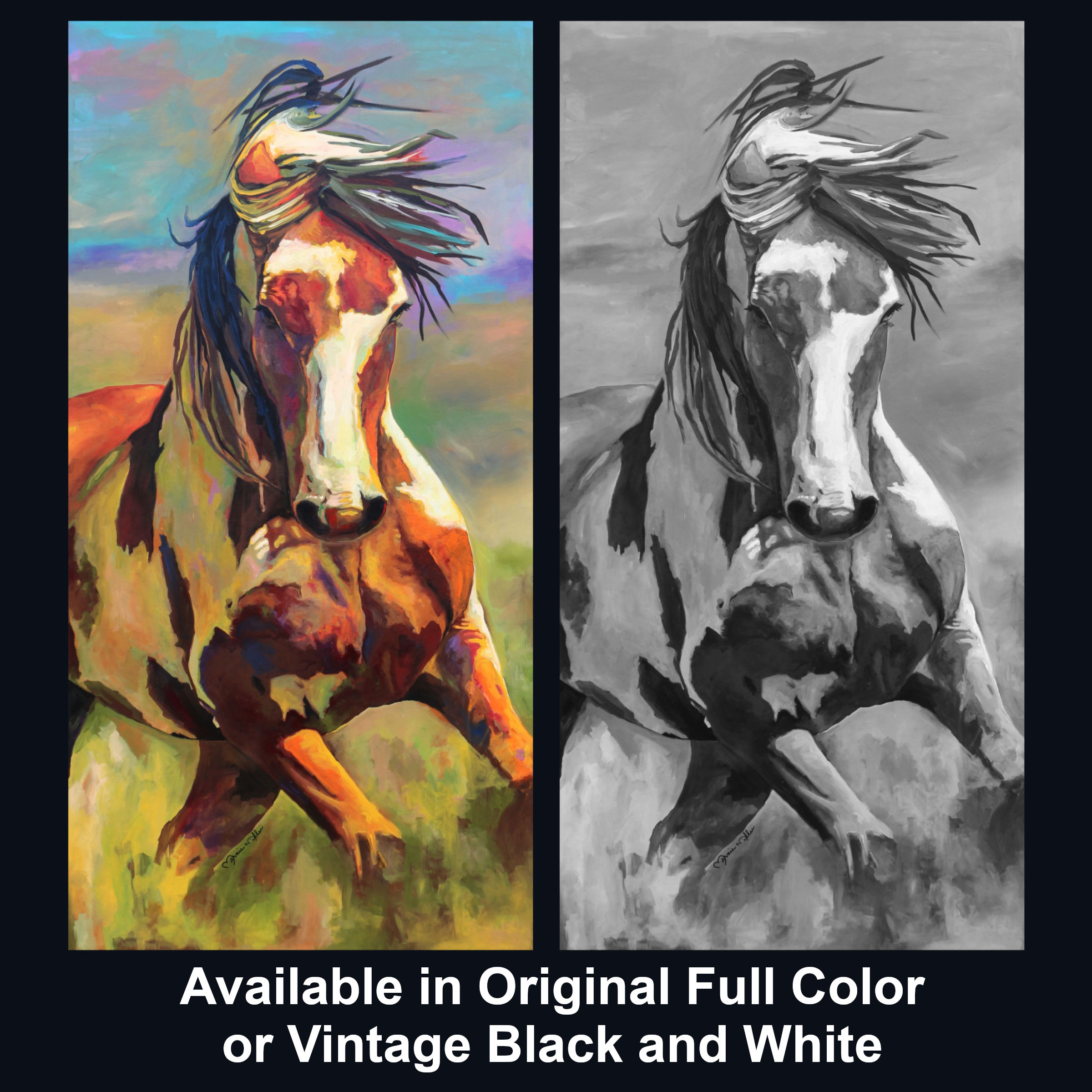 Captured mid-stride, mane flying and body charged with motion, Picasso radiates dominance, beauty, and unbreakable spirit. The bold, expressive color palette mirrors his energy—raw, untamed, and alive. This is not a romanticized image of a horse; it is a portrait of a king. A leader. A protector and provider. A stallion whose presence commanded respect and whose legacy still runs wild across the American West.