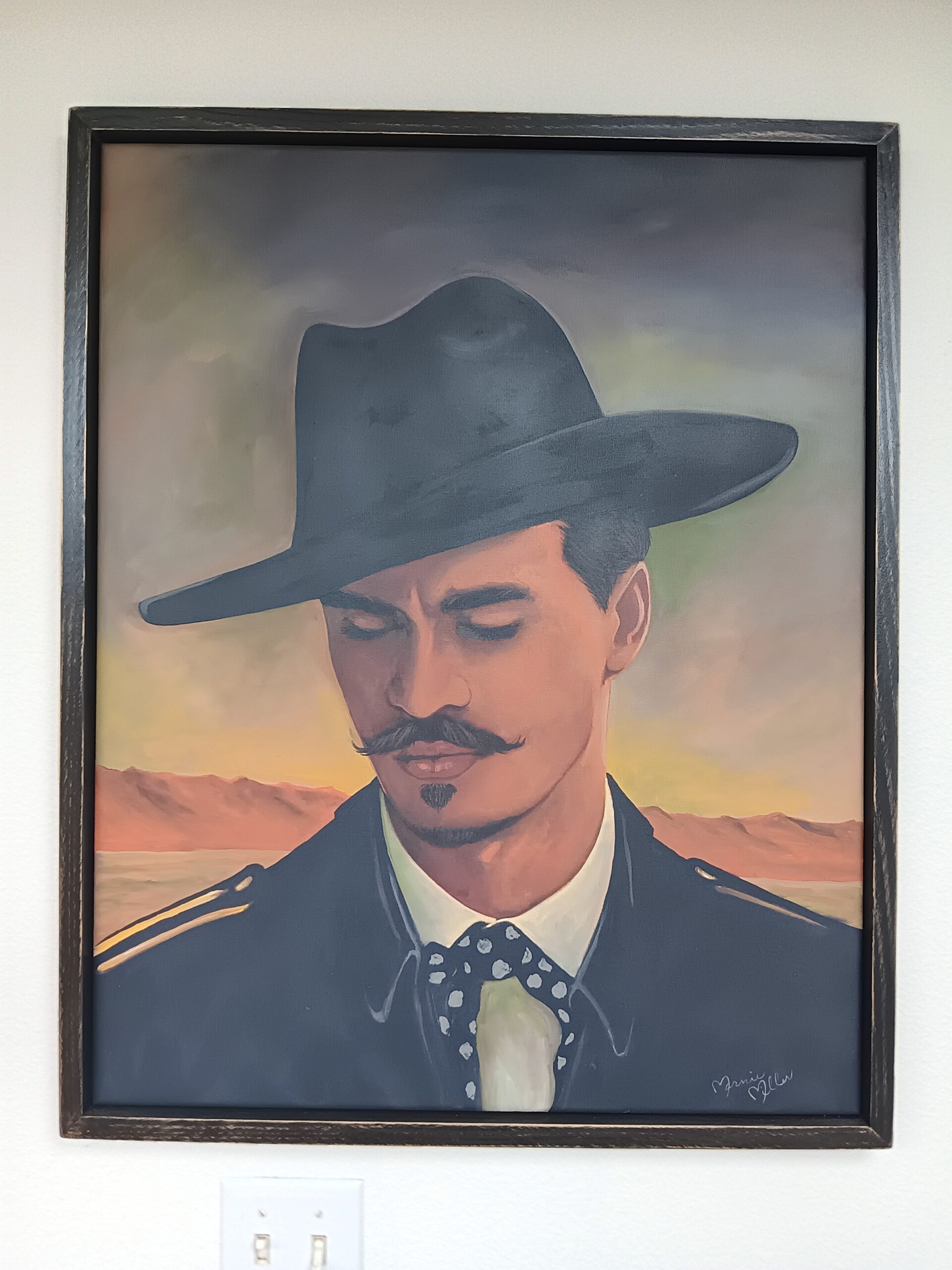 Painted entirely by hand using layered mixed media on museum-quality cotton canvas, the work balances strength and introspection. Holliday’s lowered gaze suggests a rare private moment — the gunslinger at rest, the philosopher beneath the legend, the man behind the myth. The desert horizon glows in muted warmth, echoing the fading light of the Old West and the enduring spirit of those who shaped it.