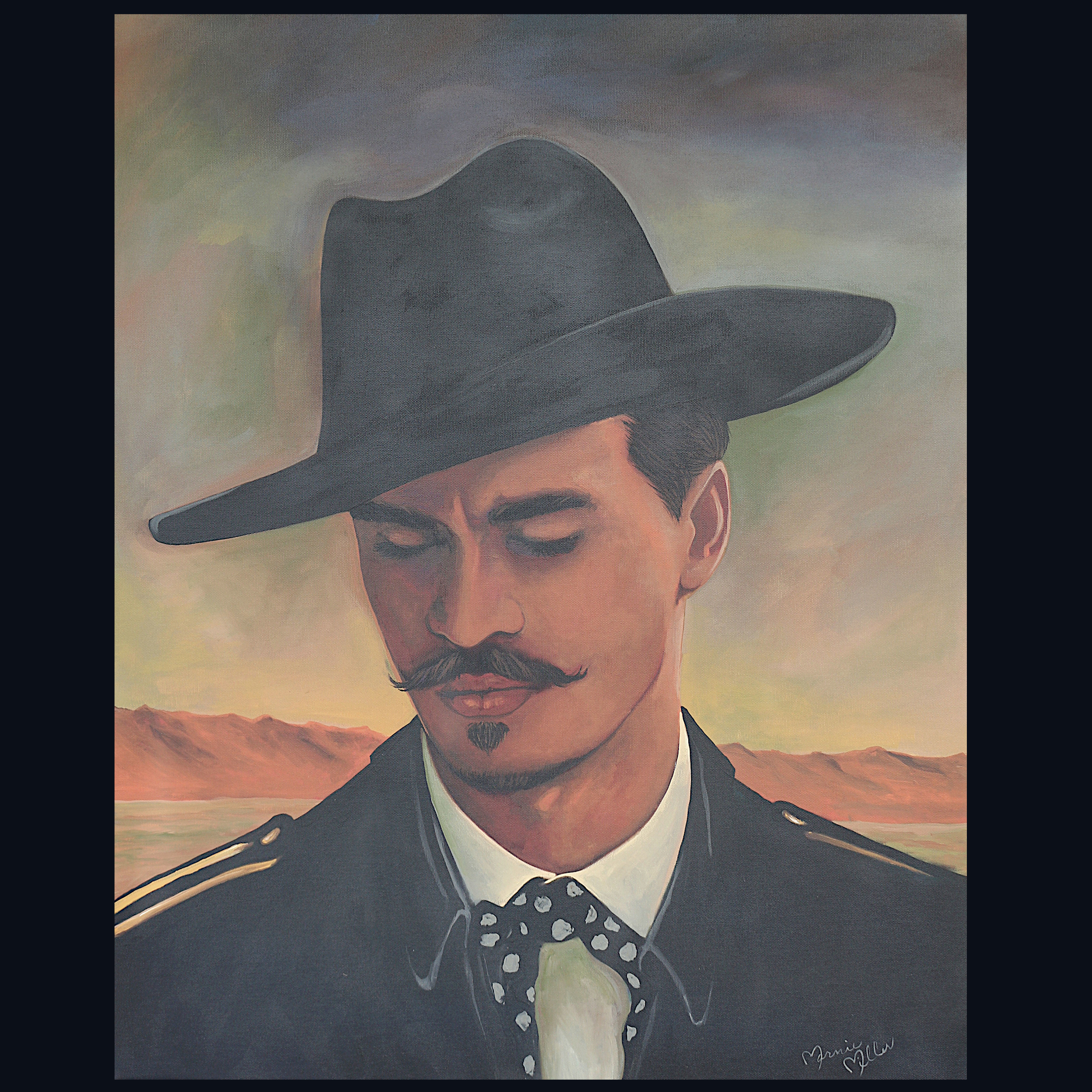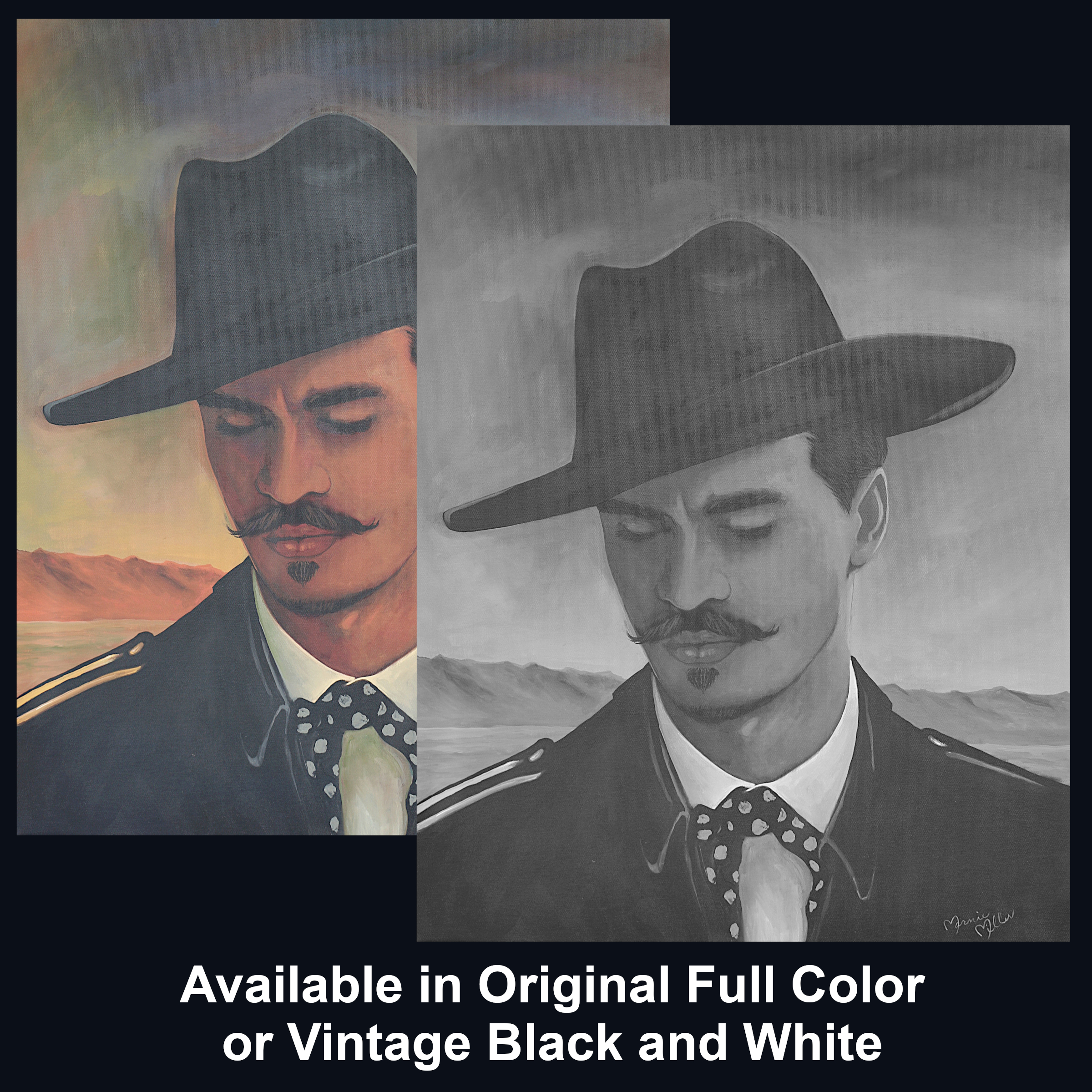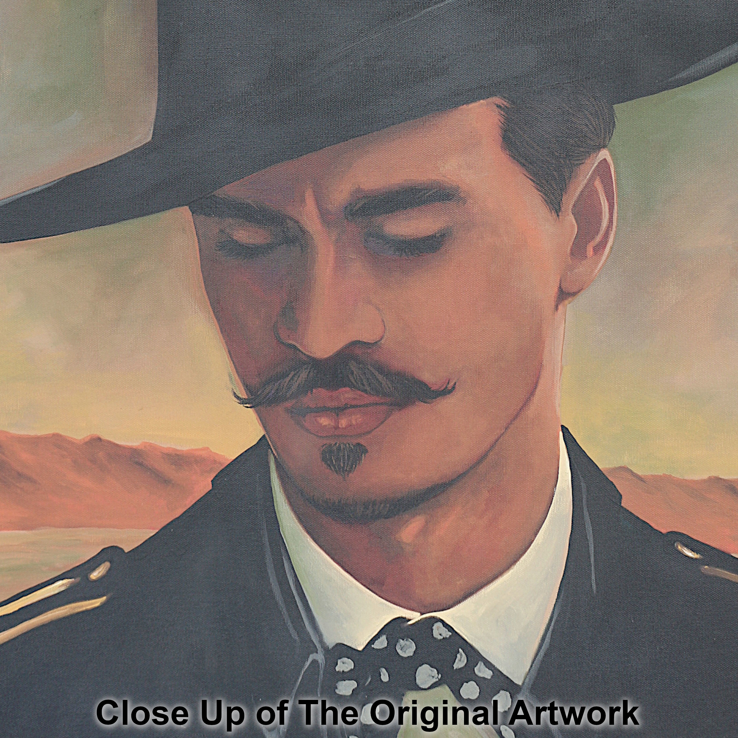 Painted entirely by hand, this piece blends modern realism with rustic Western soul. Doc’s refined mustache, sharp collar, and signature hat speak to his Southern gentleman roots, while the vast desert behind him reminds us that Tombstone was a place where men lived fast, spoke plainly, and faced consequences without flinching. The muted palette and atmospheric sky evoke the stillness before—or after—the storm.