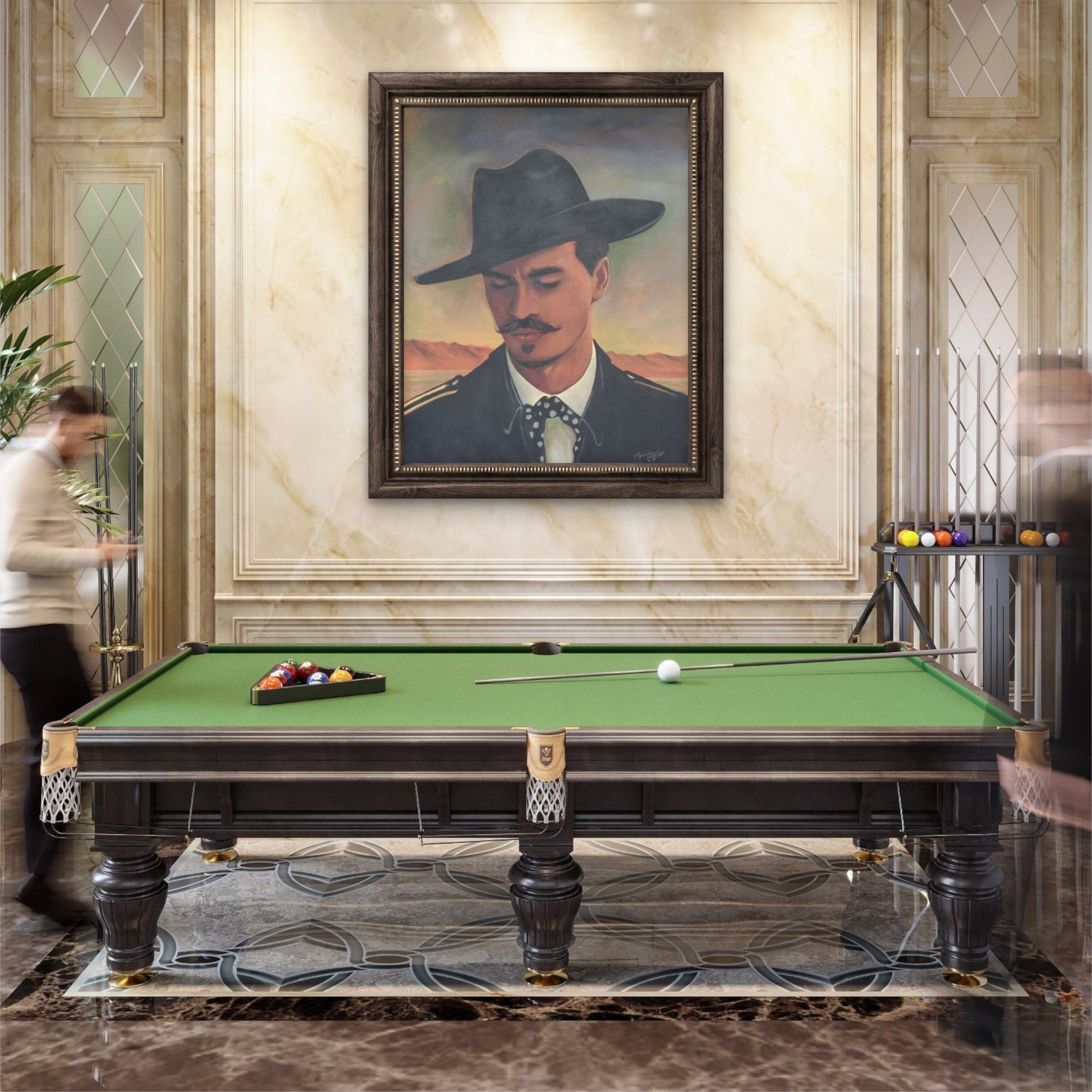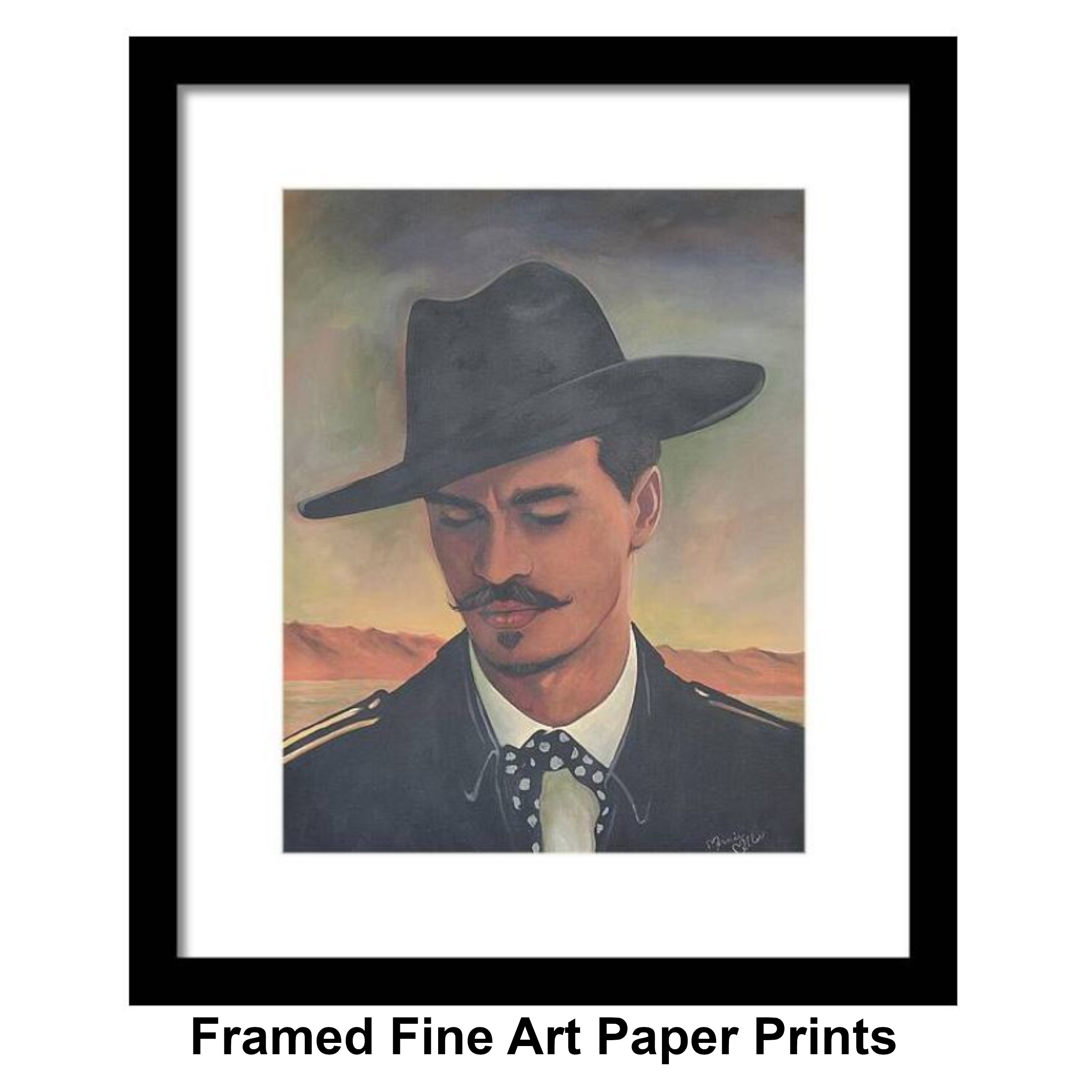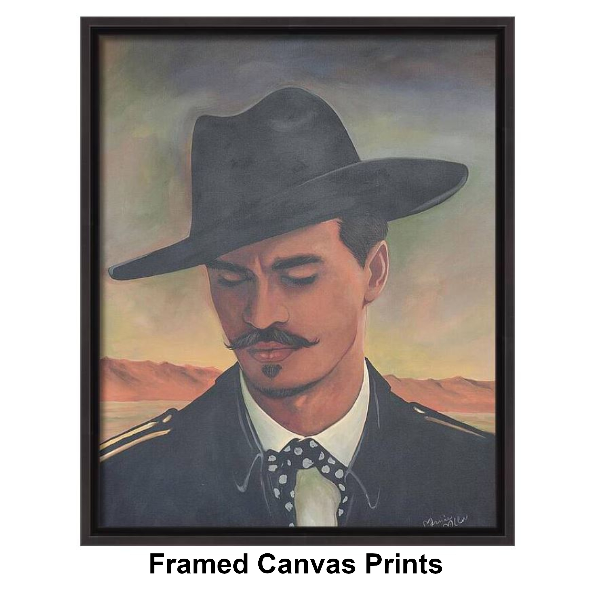 Painted entirely by hand, this piece blends modern realism with rustic Western soul. Doc’s refined mustache, sharp collar, and signature hat speak to his Southern gentleman roots, while the vast desert behind him reminds us that Tombstone was a place where men lived fast, spoke plainly, and faced consequences without flinching. The muted palette and atmospheric sky evoke the stillness before—or after—the storm.