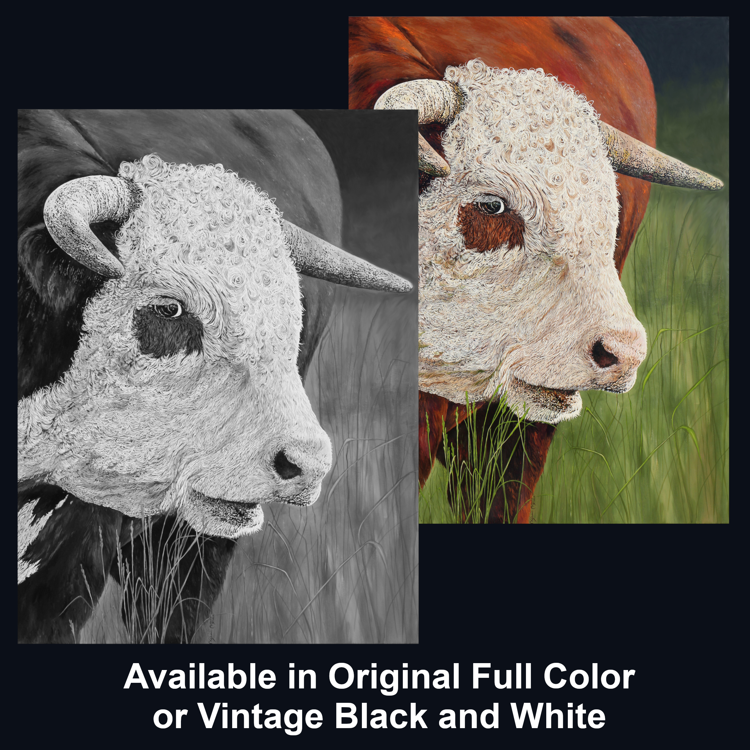 “Tobasco” is a deeply personal and masterfully rendered portrait of a curly-faced Hereford bull—powerful, intelligent, and unexpectedly gentle. Painted entirely by hand, this work captures the dual nature of the Hereford breed: immense physical strength paired with calm temperament and soulful, almost tender eyes. Though intimidating in stature, Tobasco carries the soft gaze of a calf, a quiet reminder of the intelligence, humor, and docile spirit that make Herefords so beloved on working ranches.