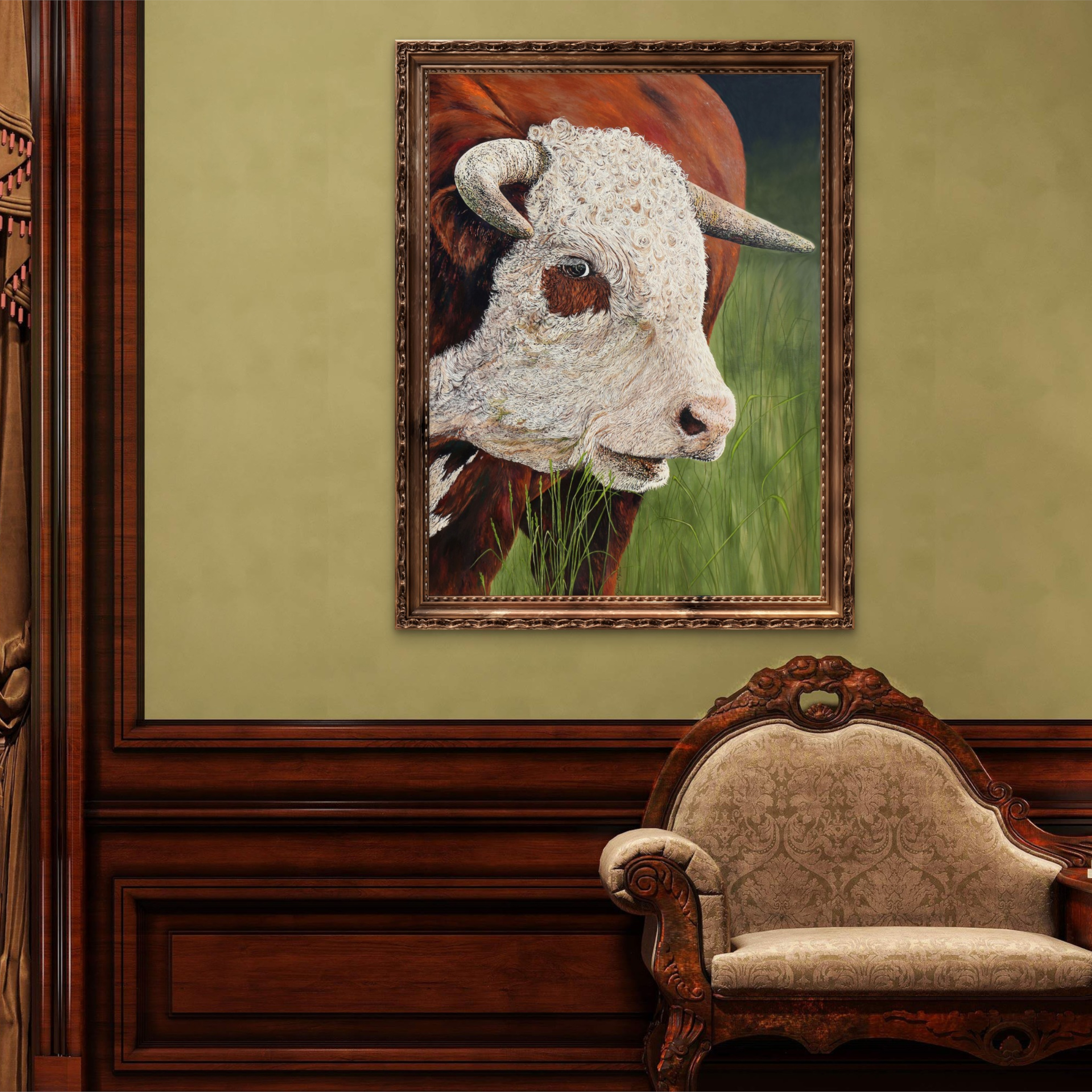 Commissioned by the Cox family of East Texas—owners of COX Ranch and COX Concrete, nationally respected manufacturers of premium concrete feeders, watering systems, culverts, and ranch infrastructure—this piece honors not only an animal, but a way of life rooted in care, quality, and stewardship. The Cox family’s deep love for their Herefords is woven into every brushstroke, making this painting both a portrait and a tribute. These are quality people, raising quality cattle, building quality products—and it shows.