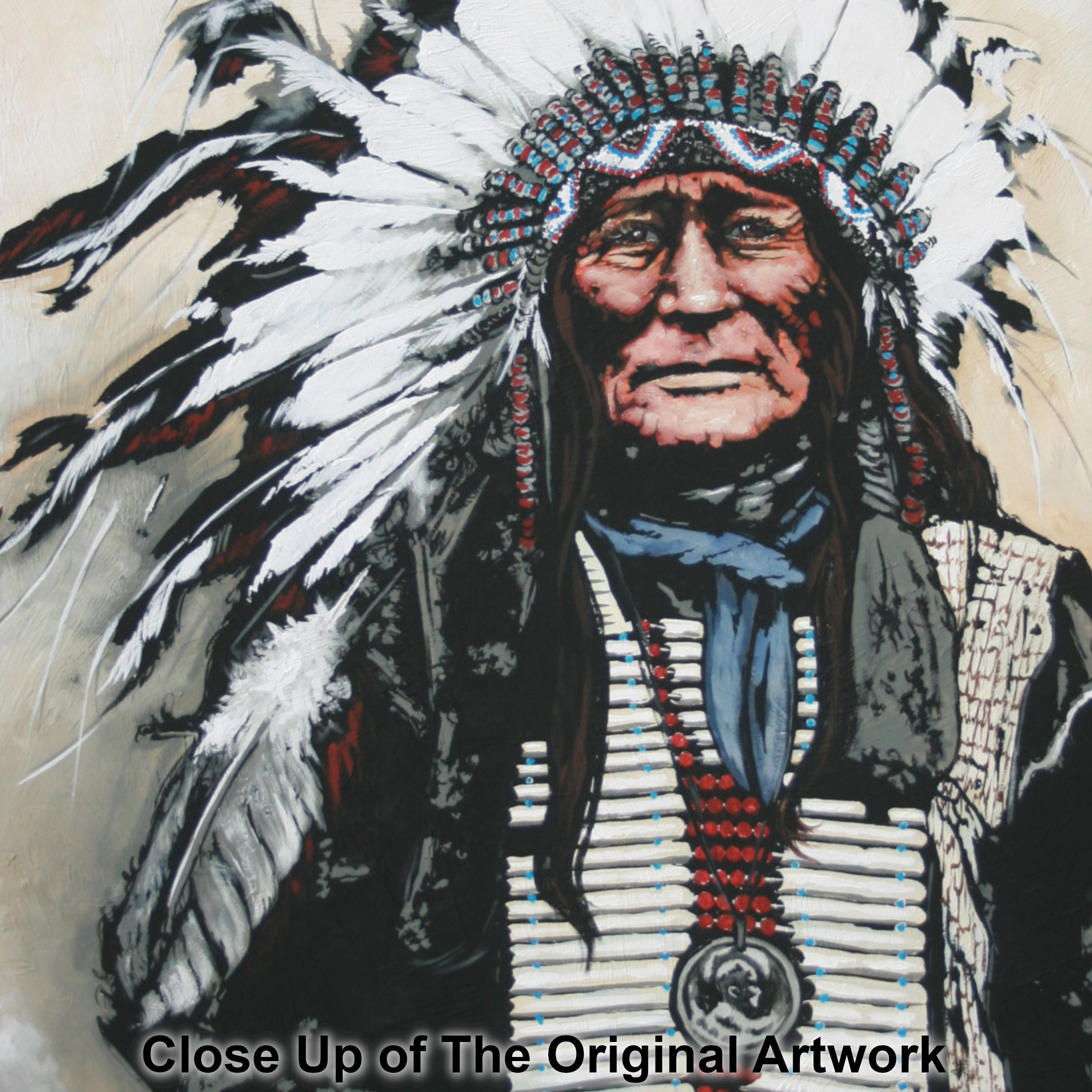 Painted entirely by hand, this artwork honors leadership rooted not in noise or bravado, but in restraint, humility, and respect. The Chief’s expression reflects a life shaped by responsibility—to people, land, and legacy. Every line in his face tells a story of perseverance, tradition, and the unspoken understanding that true power does not need to announce itself.