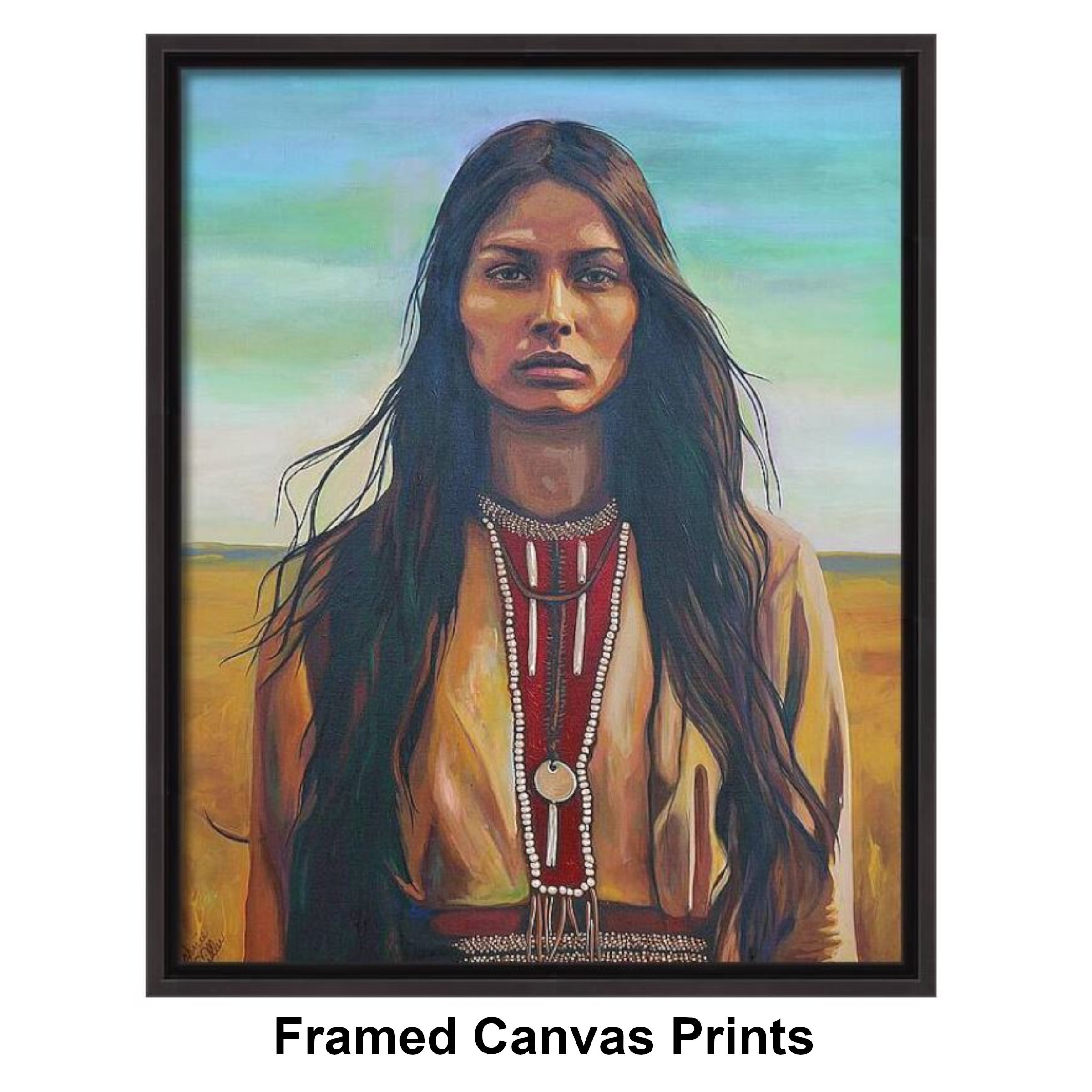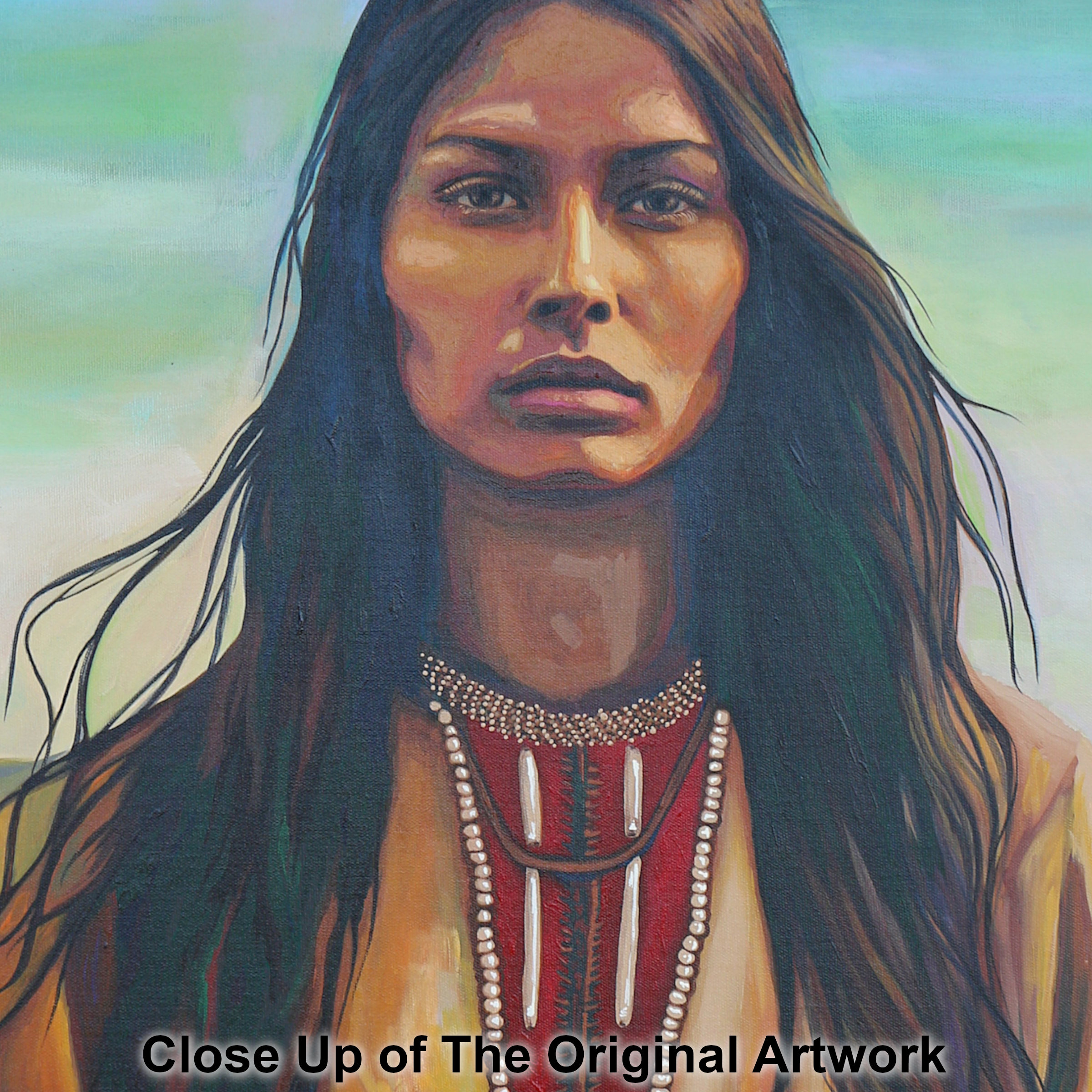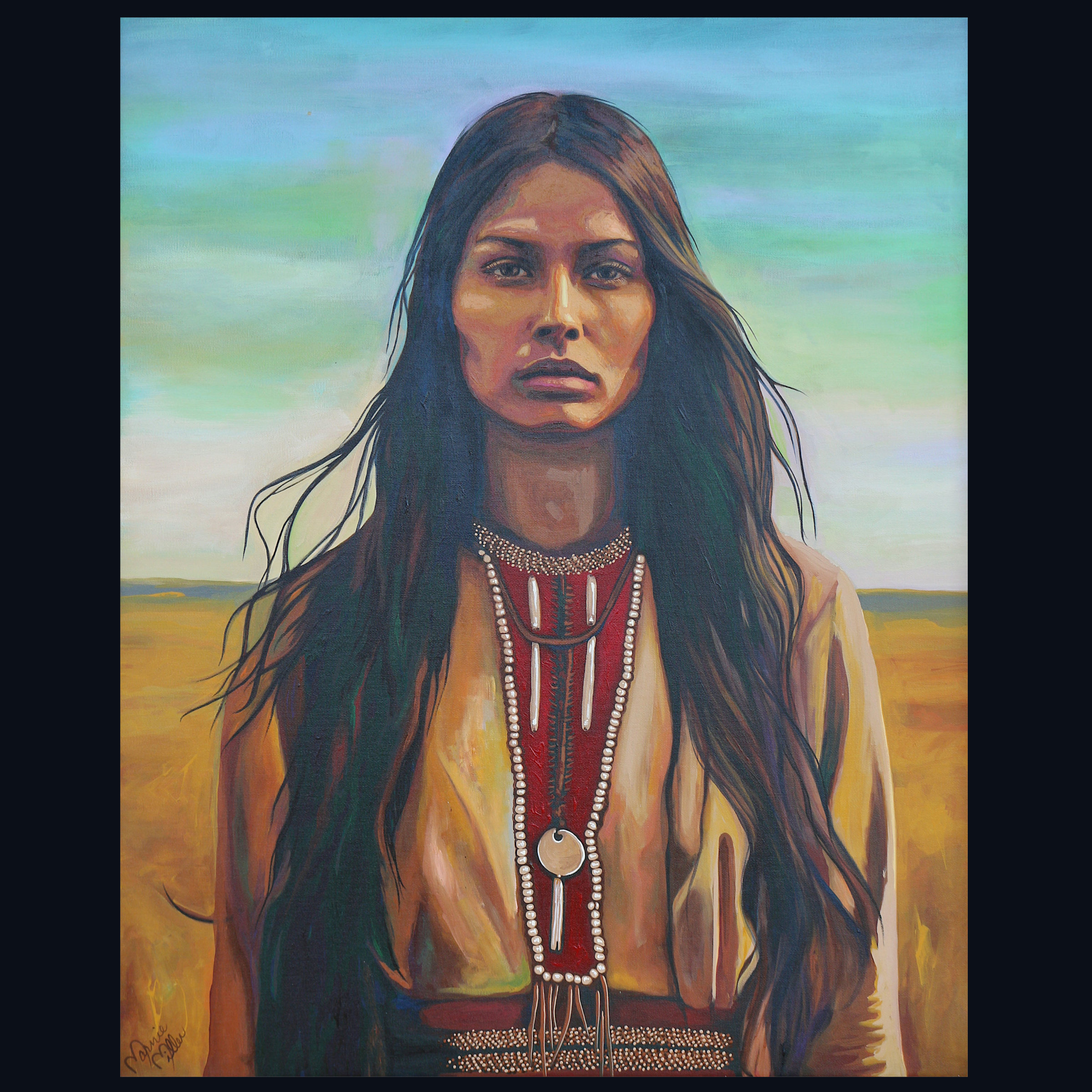 Painted entirely by hand, “Whispers in the Wind” explores a softer but no less powerful form of resilience. The intricate beadwork and adornments resting against her chest are rendered with careful intention, symbolizing lineage, connection, and continuity. The warm earth tones of her clothing blend seamlessly with the surrounding land, reinforcing the bond between woman, spirit, and place. She feels rooted, timeless, and present—part of the land rather than separate from it.