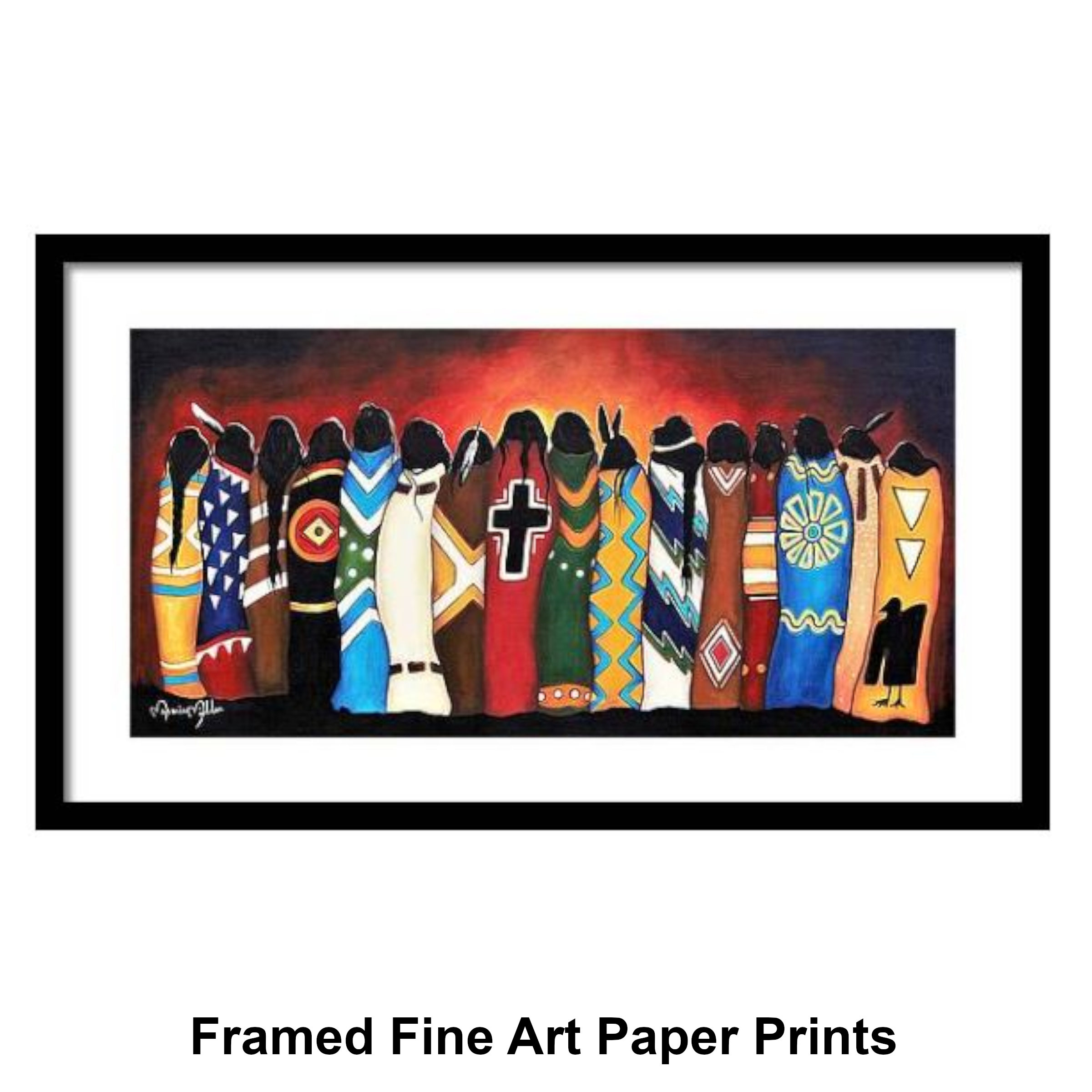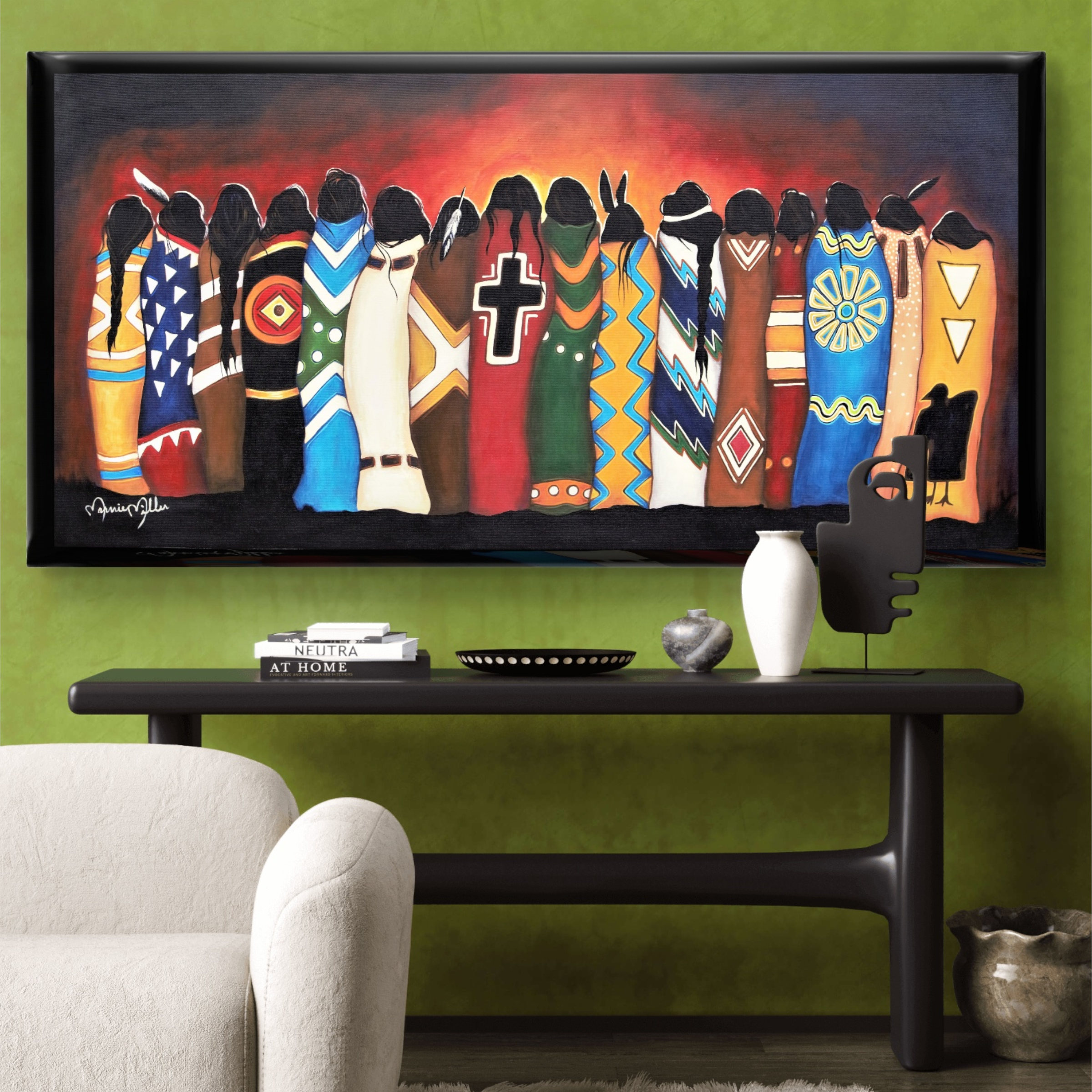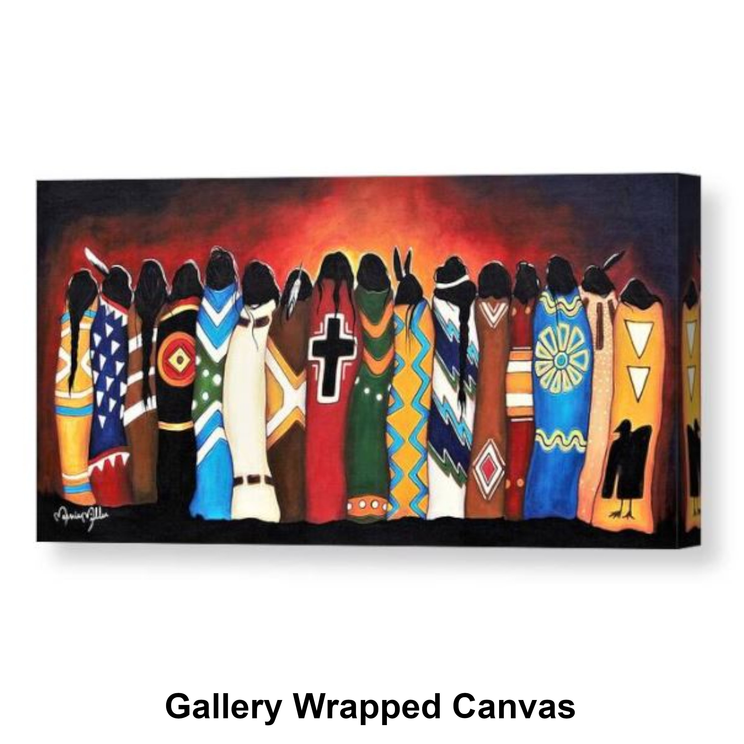 This painting speaks without faces, without voices, and without spectacle. Instead, it communicates through presence, symbolism, and collective strength. Each woman is wrapped in a blanket carrying sacred meaning—stories of mourning, protection, rage, prayer, transformation, and hope. Together, they form a unified vigil: standing shoulder to shoulder, honoring those who are gone and fighting for those still here.