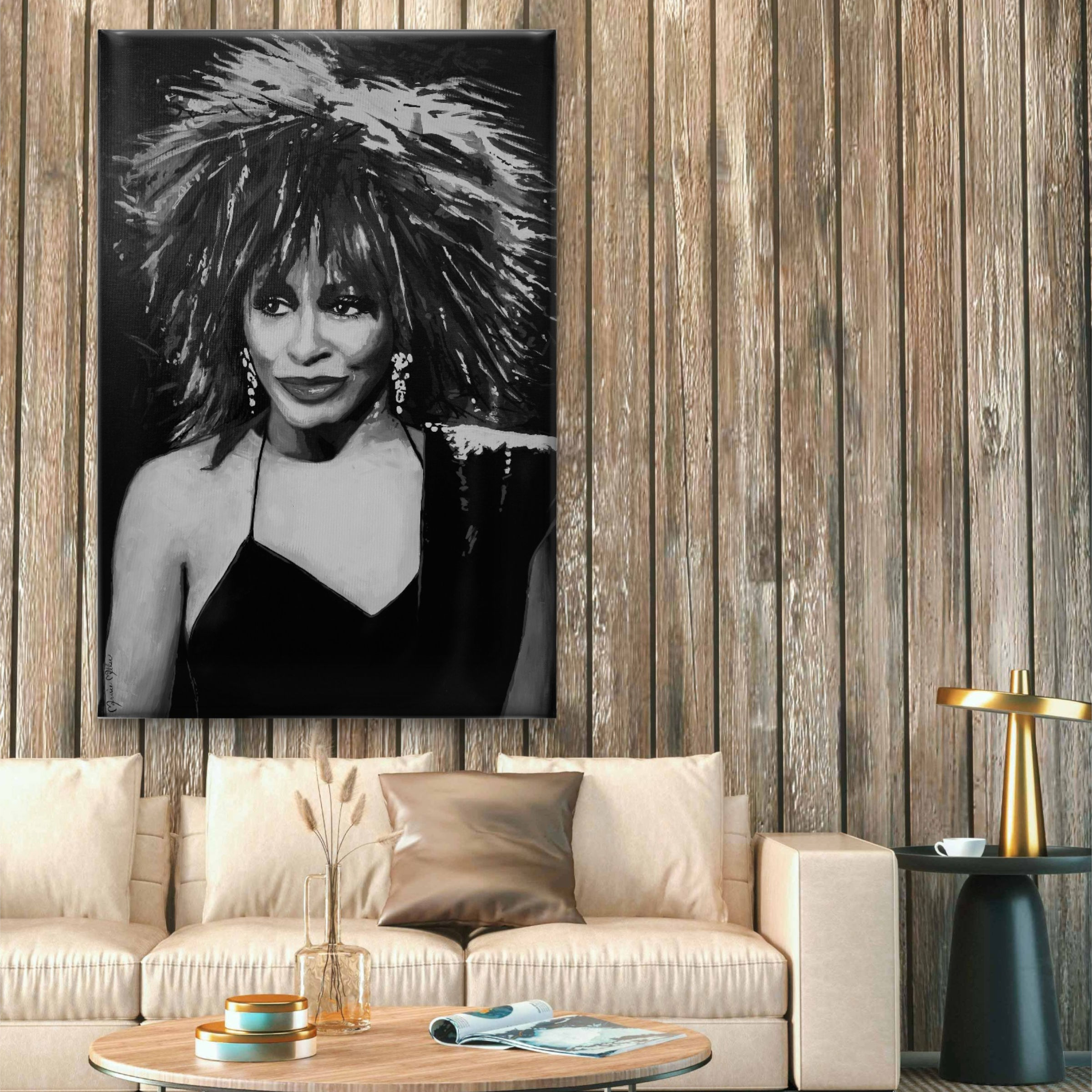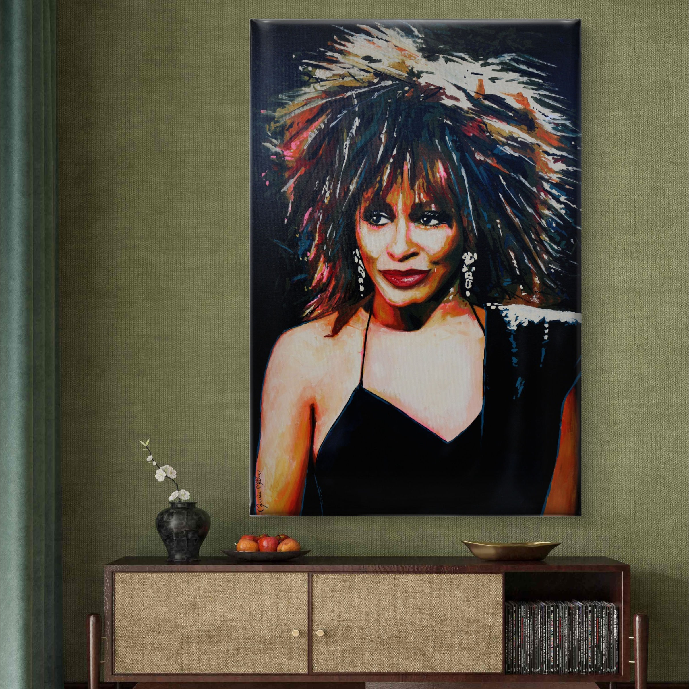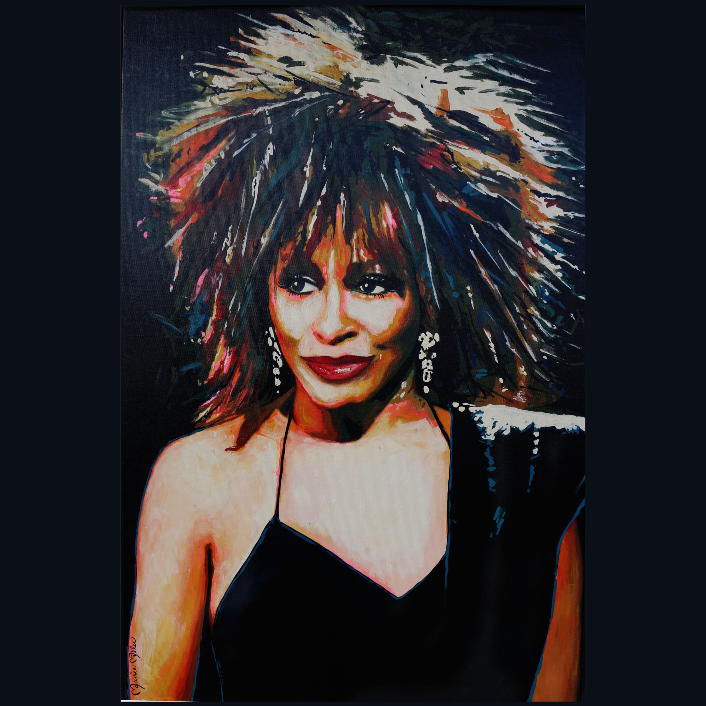 Painted with explosive energy and expressive movement, Tina emerges from a dark, dramatic background with blazing confidence. Her signature hair bursts outward like a crown of fire, echoing the electricity she brought to every stage she ever touched. Rich reds, warm flesh tones, and vibrant highlights collide with deep shadows, creating a sense of motion, strength, and unapologetic presence. This is Tina in her full glory — commanding, glamorous, and absolutely in control.